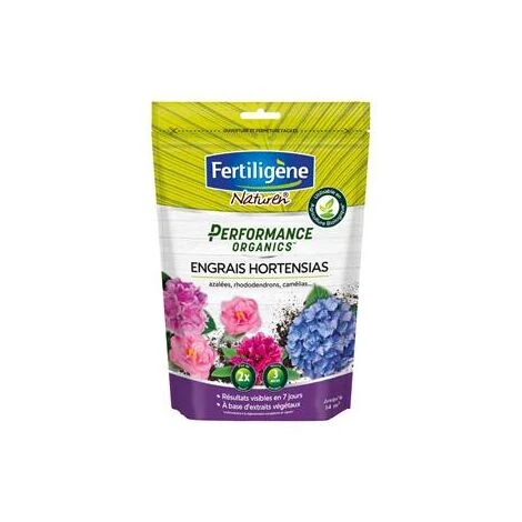 - Le sachet de 700 g. Formule 100% naturelle utilisable en agriculturebiologique. L’engrais Performance OrganicsHortensias d’origine vĂ©gĂ©tale et enrichi en guanomarin permet des rĂ©sultats visibles dès 7 jours etnourrit vos plantes jusqu’Ă trois mois !AdaptĂ© Ă toutes les variĂ©tĂ©s de plantes acidophilesil vous garantit des rĂ©sultats extraordinaires :2 fois plus de fleurs !ENGRAIS NF U 42-001 – Engrais organo-minĂ©ral NPK 7-5-8 + 2- 7 % d’Azote (N) total dont 5,9 % de tourteaux vĂ©gĂ©taux et de guano marin.- 5 % d’Anhydride phosphorique (P 205) total – 8 % d’Oxyde de Potassium (K20)total 3% soluble dans l’eau. – 2% d’Oxyde de MagnĂ©sium (MgO) total.