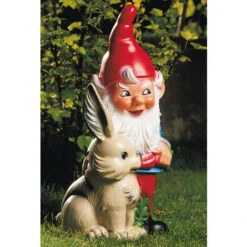 Ce nain de jardin classique avec un lapin a une hauteur d’environ 30 cm.