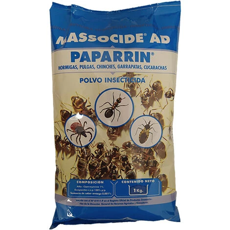 PaparrĂn Massocide AD de MassĂł est une poudre insecticide Ă usage domestique efficace pour Ă©liminer les fourmis, les puces, les punaises de lit, les tiques et les cafards. L’ingrĂ©dient actif est l’alpha-cypermĂ©thrine, un insecticide pyrĂ©thrinoĂŻde qui a une action de choc rapide et une grande efficacitĂ©. Il s’agit d’un produit prĂ©parĂ© sous forme de poudre insecticide très facile Ă appliquer par saupoudrage, spĂ©cialement formulĂ© pour lutter contre les insectes nuisibles dans le domaine de l’Ă©levage et phytosanitaire.