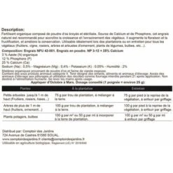 - La dĂ©composition progressive de la poudre d’os dans le sol libère en continu du phosphore et du calcium pendant plusieurs mois.