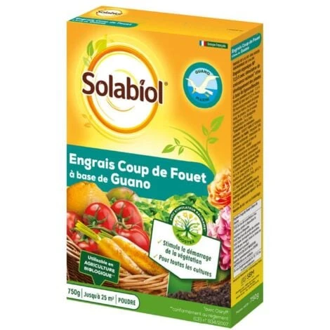 MĂ©langez l’engrais coup de fouet Ă base de guano marin avec de l’eau selon les doses recommandĂ©es sur l’emballage. Appliquez sur les plantes en les arrosant ou en utilisant un pulvĂ©risateur. Il est conseillĂ© d’utiliser l’engrais tout au long de la croissance de vos plantes, en respectant les doses et les frĂ©quences d’utilisation recommandĂ©es.